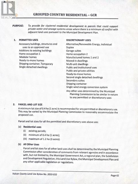 PRIMARY POWER LINES ARE GOING IN !!!! Here is your chance to bring your ideas and purchase your very own acreage lot. With the Grouped Country Residential zoning it will give you numerous options under the permitted and discretionary uses. There are very limited acreage lots available at this size and price. At just under 5 acres the possibilities are endless. For the naturalists these lots still contain untouched prairie wool grasses. The County of Vulcan has been a gem to deal with as well as the inspectors making the development process straightforward. Call your favorite agent today and lets discuss options!!! (id:7303)