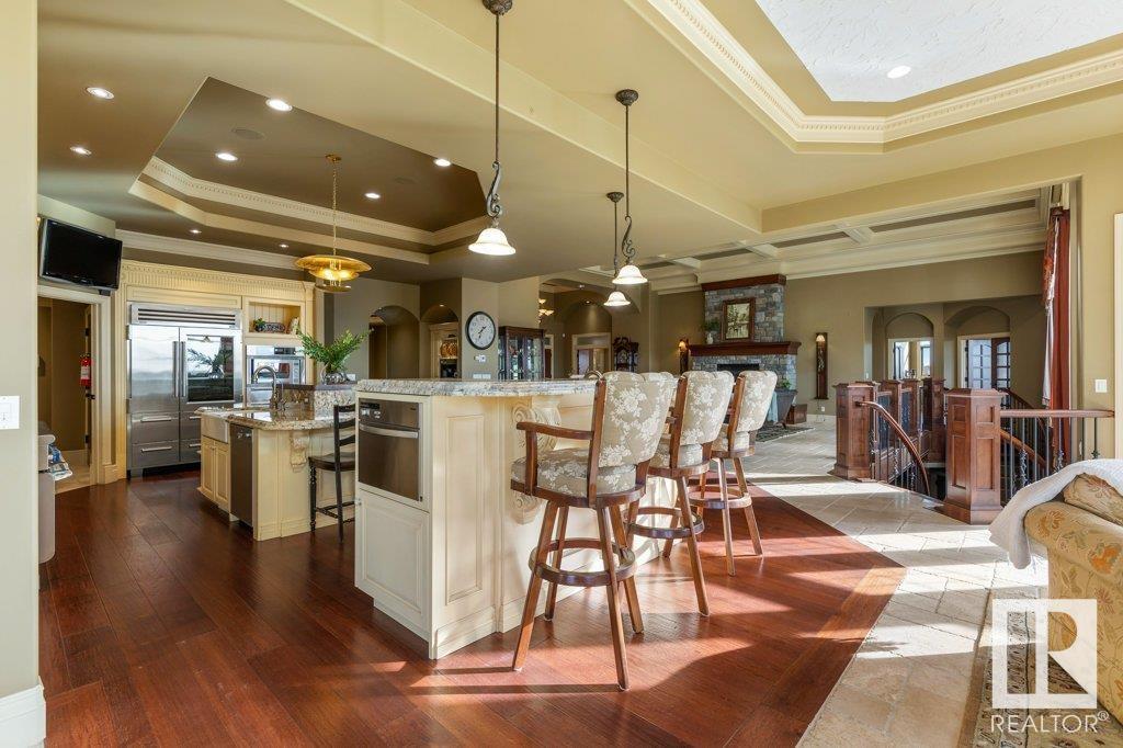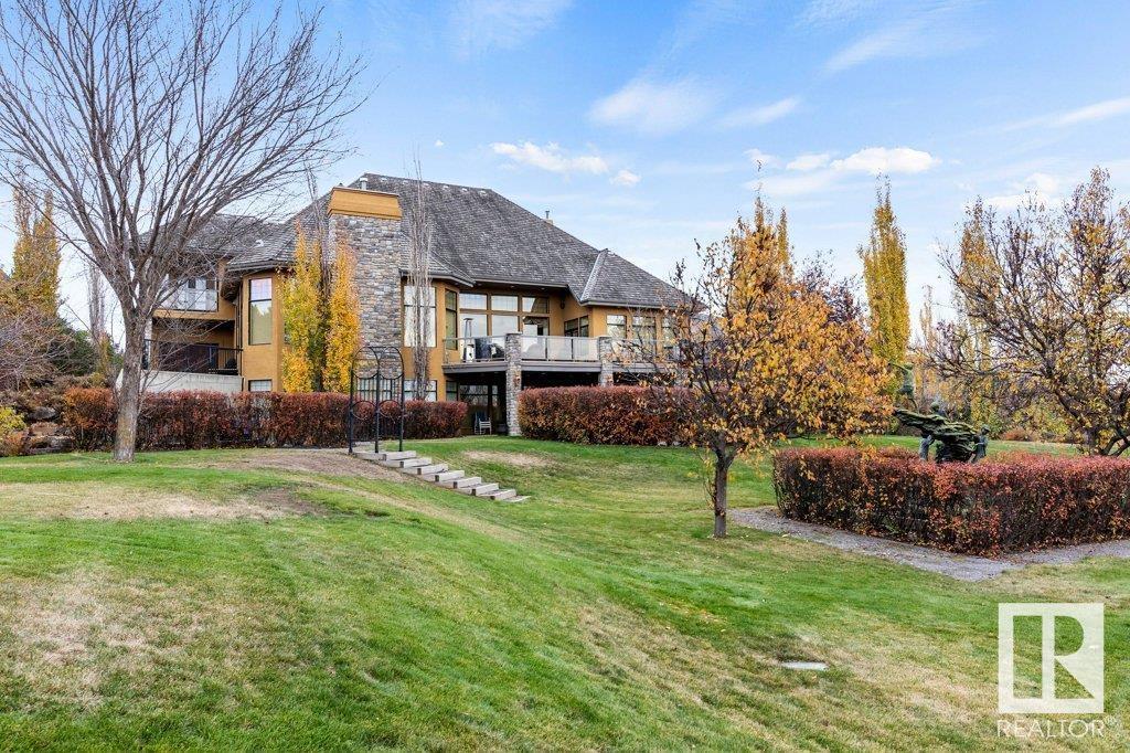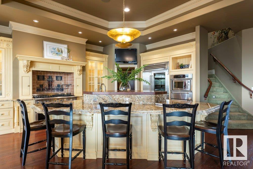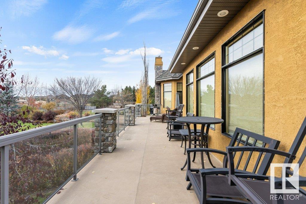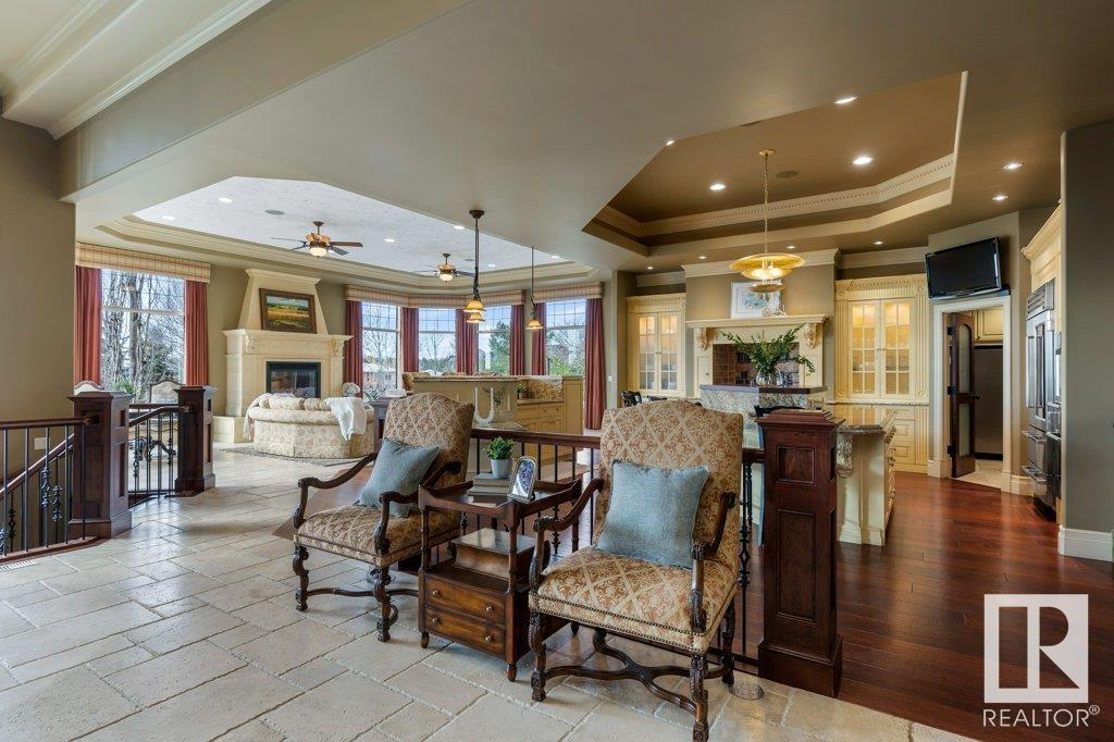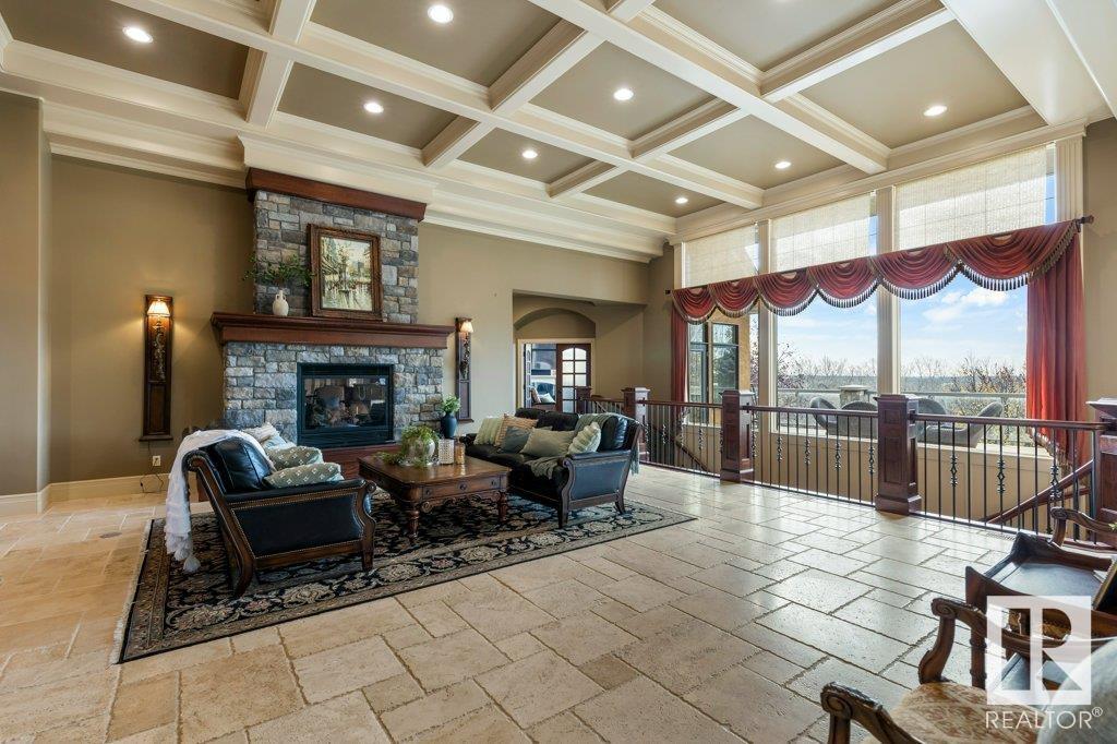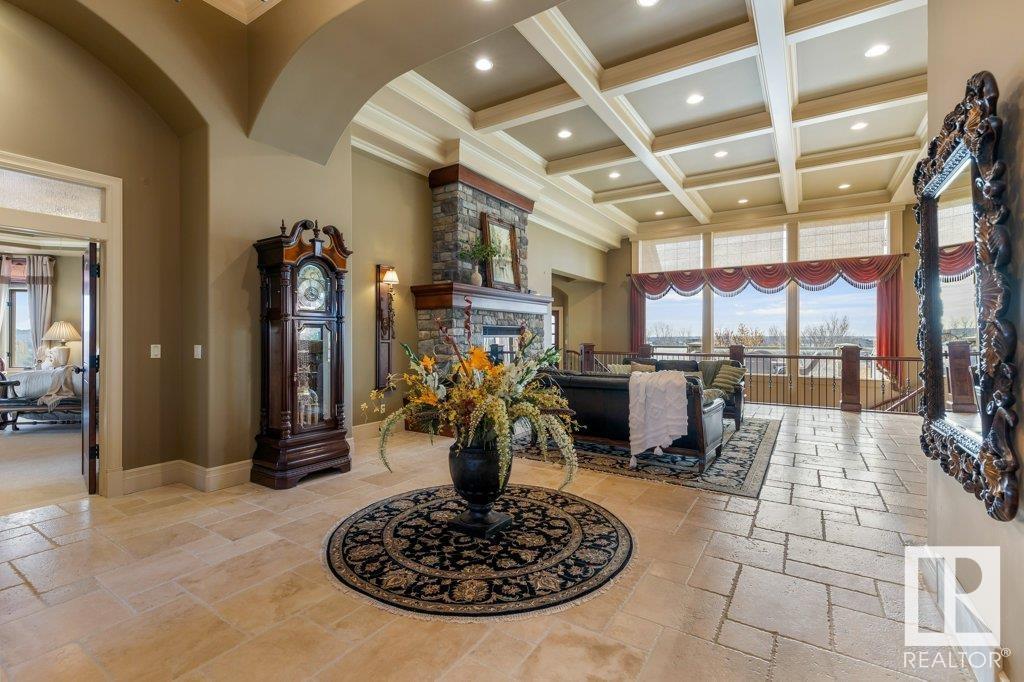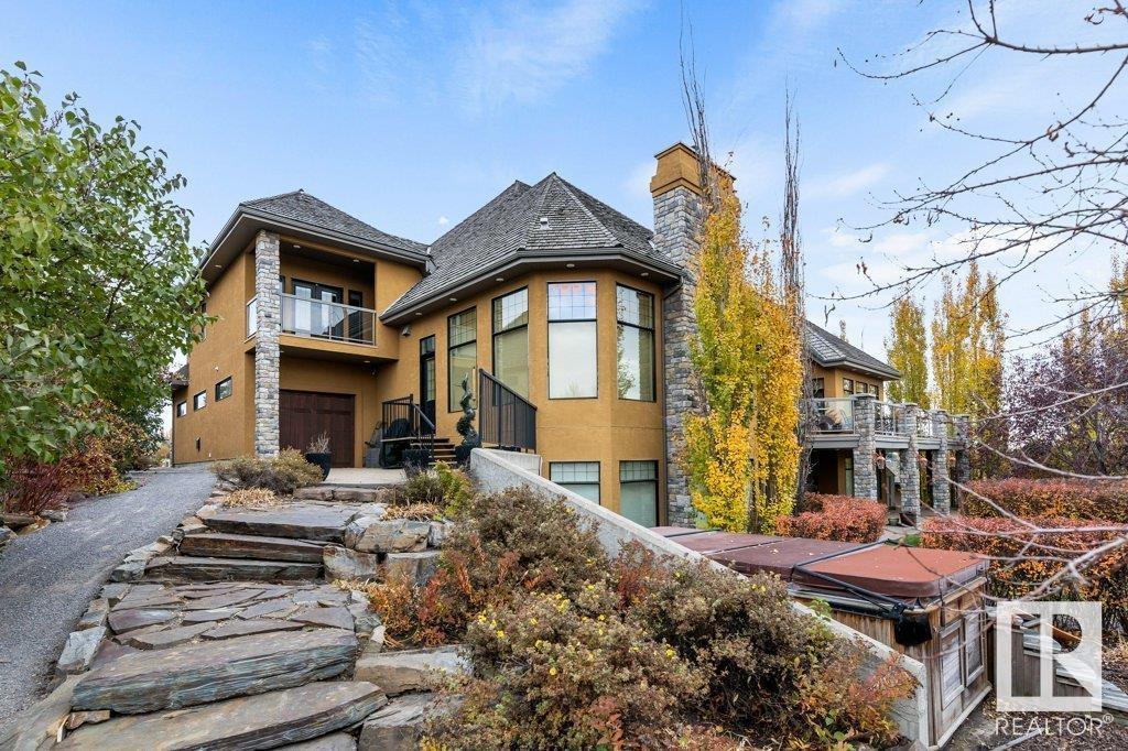 DISCOVER YOUR PRIVATE SANCTUARY IN RIVERSTONE POINTE FEATURING 8,800 SQFT OF SPECTACULAR LIVING SPACE this walk-out bungalow offers a rare blend of luxury and tranquility. With stunning river valley views, this custom-built masterpiece boasts captivating curb appeal, custom stone pillars, & a quad garage. Step inside to experience a true sanctuary, barrel roll ceiling, complete with limestone, cork & mahogany floors, coffered ceilings, custom millwork, grand designer staircase & banks of windows. The gourmet kitchen inspired by Clive Christian, featuring Brazilian hardwood, granite countertops, two expansive breakfast bar islands, and a massive pantry. Retreat to the resort-style primary suite, which includes a spa-inspired 6-piece ensuite with double stone showers, a gas fireplace and a lavish walk-in closet. With 5 bedrooms, 7 bathrooms, & 6 fireplaces, library, theatre room, exercise room, radiant heat, 52 ft. balcony & sports court, this home is perfect for both relaxation & entertaining! (id:7303)