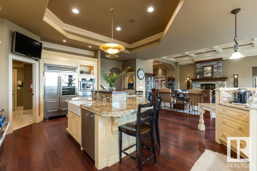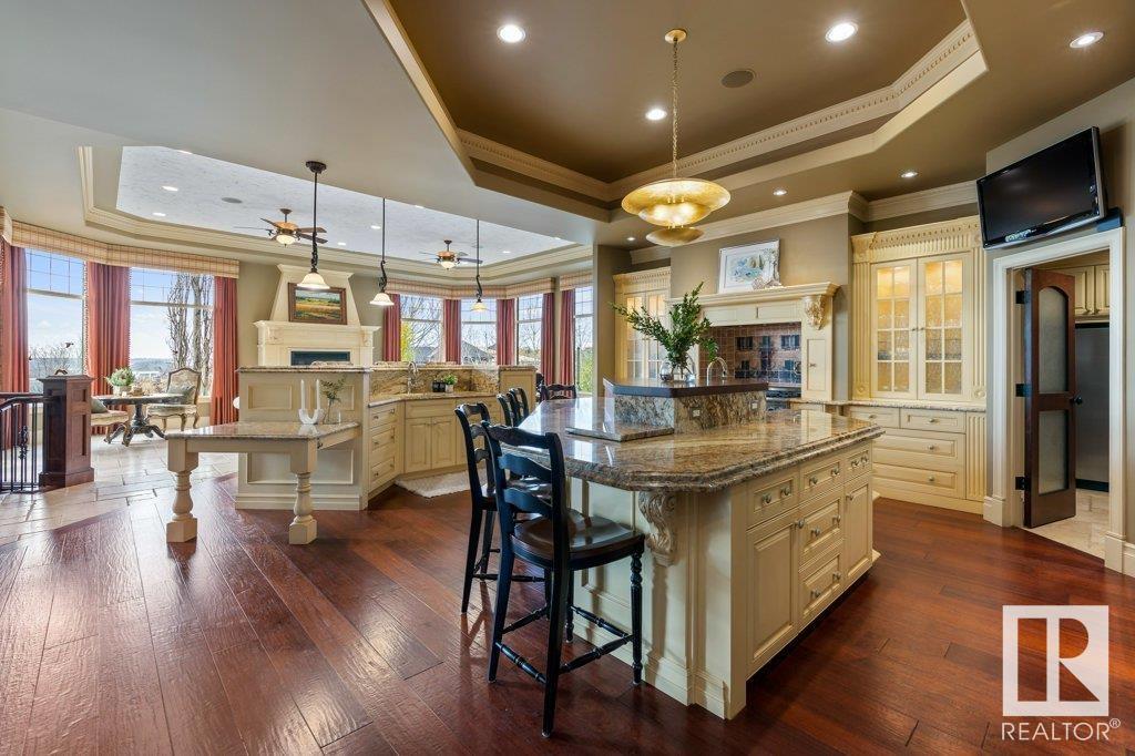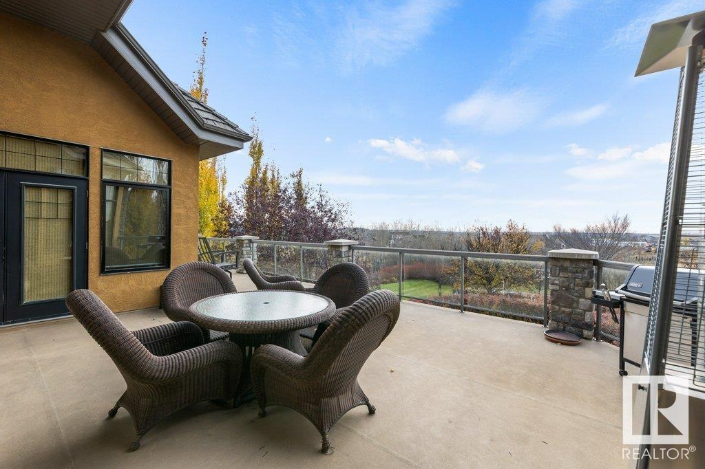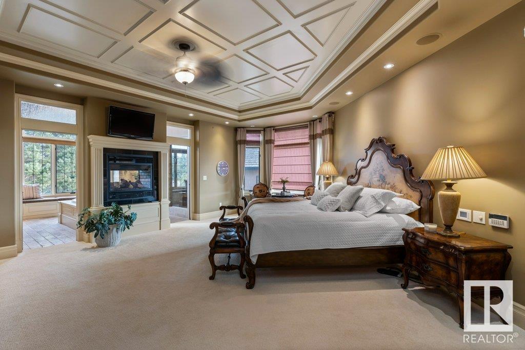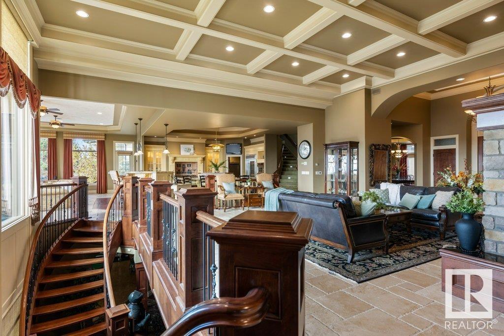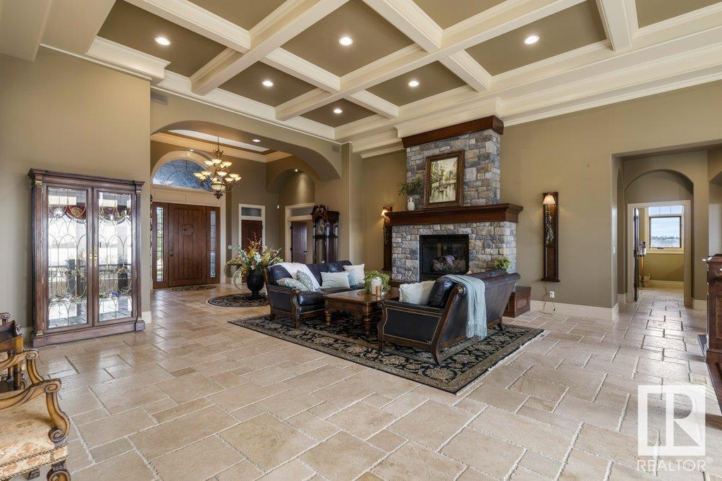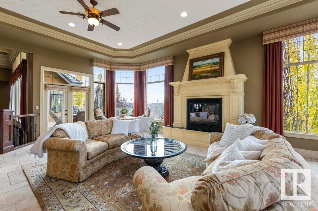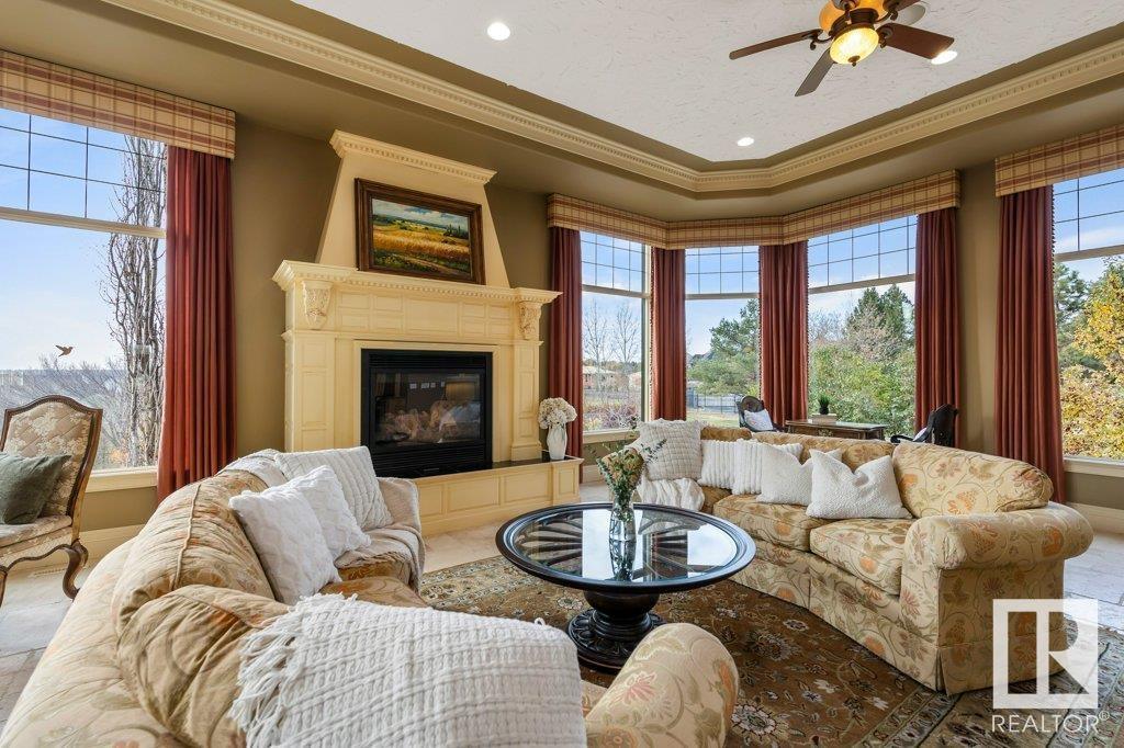 DISCOVER YOUR PRIVATE SANCTUARY IN RIVERSTONE POINTE FEATURING 8,800 SQFT OF SPECTACULAR LIVING SPACE this walk-out bungalow offers a rare blend of luxury and tranquility. With stunning river valley views, this custom-built masterpiece boasts captivating curb appeal, custom stone pillars, & a quad garage. Step inside to experience a true sanctuary, barrel roll ceiling, complete with limestone, cork & mahogany floors, coffered ceilings, custom millwork, grand designer staircase & banks of windows. The gourmet kitchen inspired by Clive Christian, featuring Brazilian hardwood, granite countertops, two expansive breakfast bar islands, and a massive pantry. Retreat to the resort-style primary suite, which includes a spa-inspired 6-piece ensuite with double stone showers, a gas fireplace and a lavish walk-in closet. With 5 bedrooms, 7 bathrooms, & 6 fireplaces, library, theatre room, exercise room, radiant heat, 52 ft. balcony & sports court, this home is perfect for both relaxation & entertaining! (id:7303)