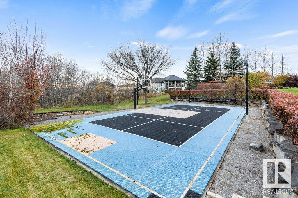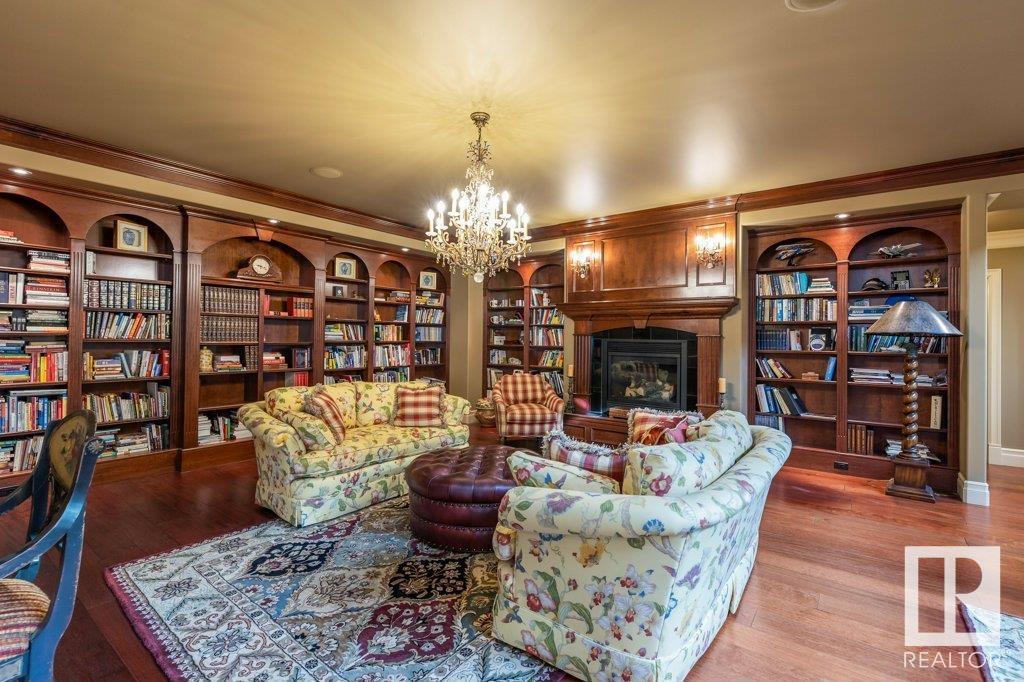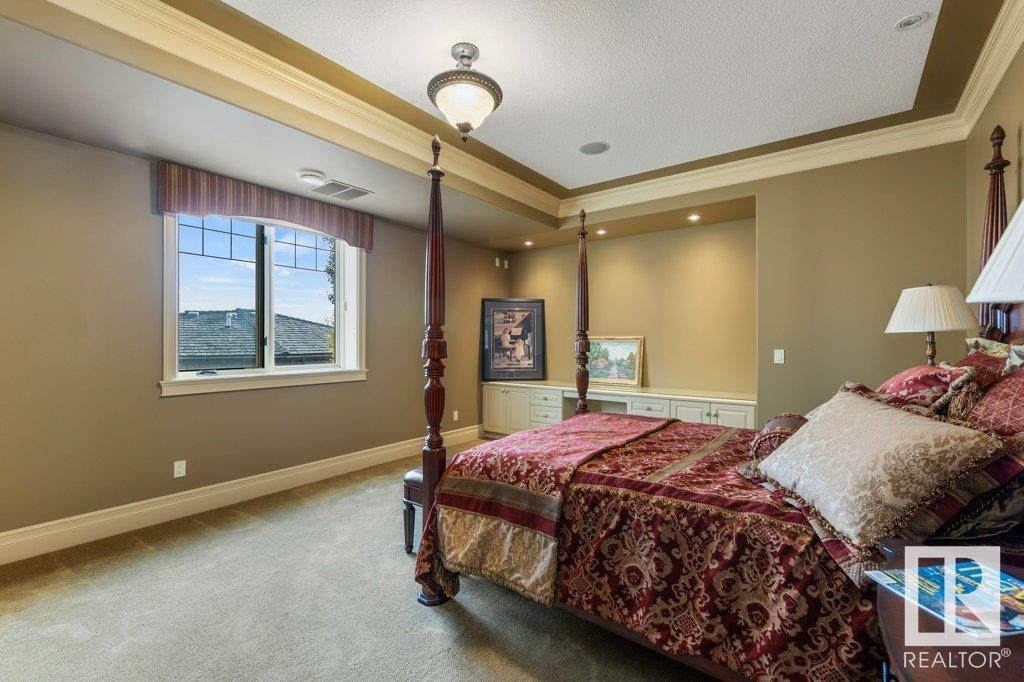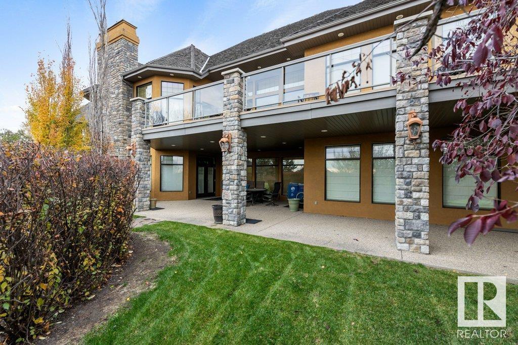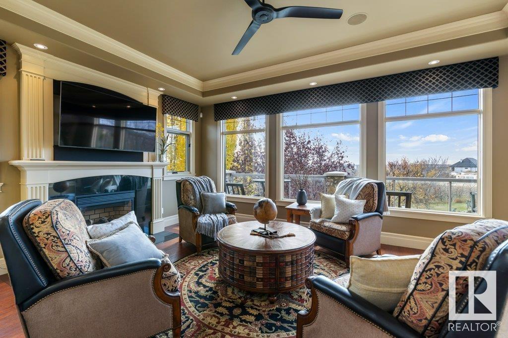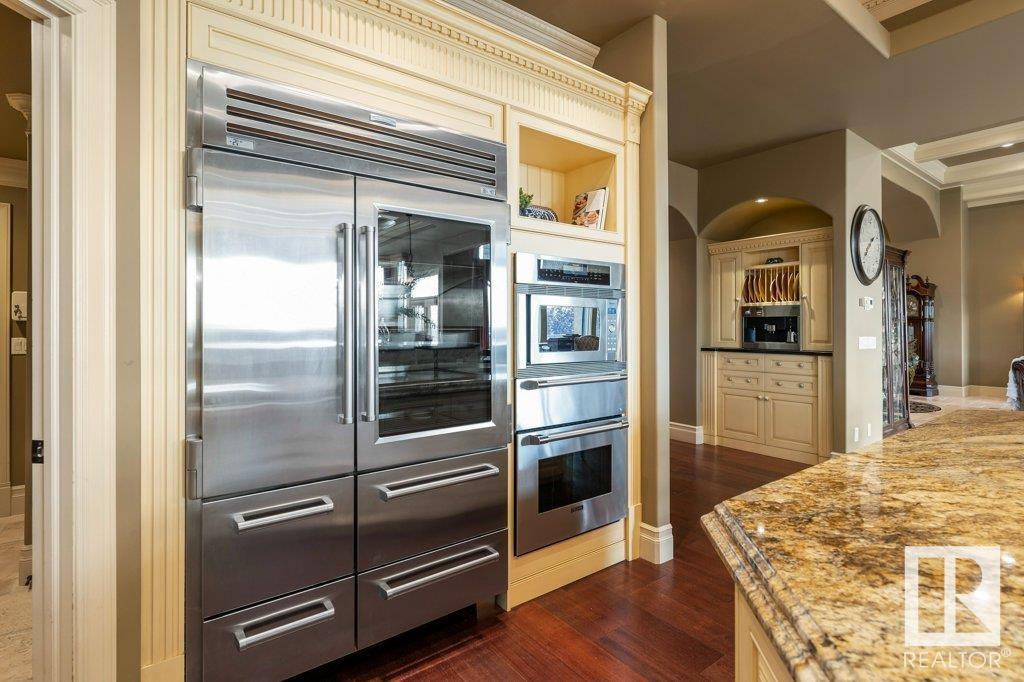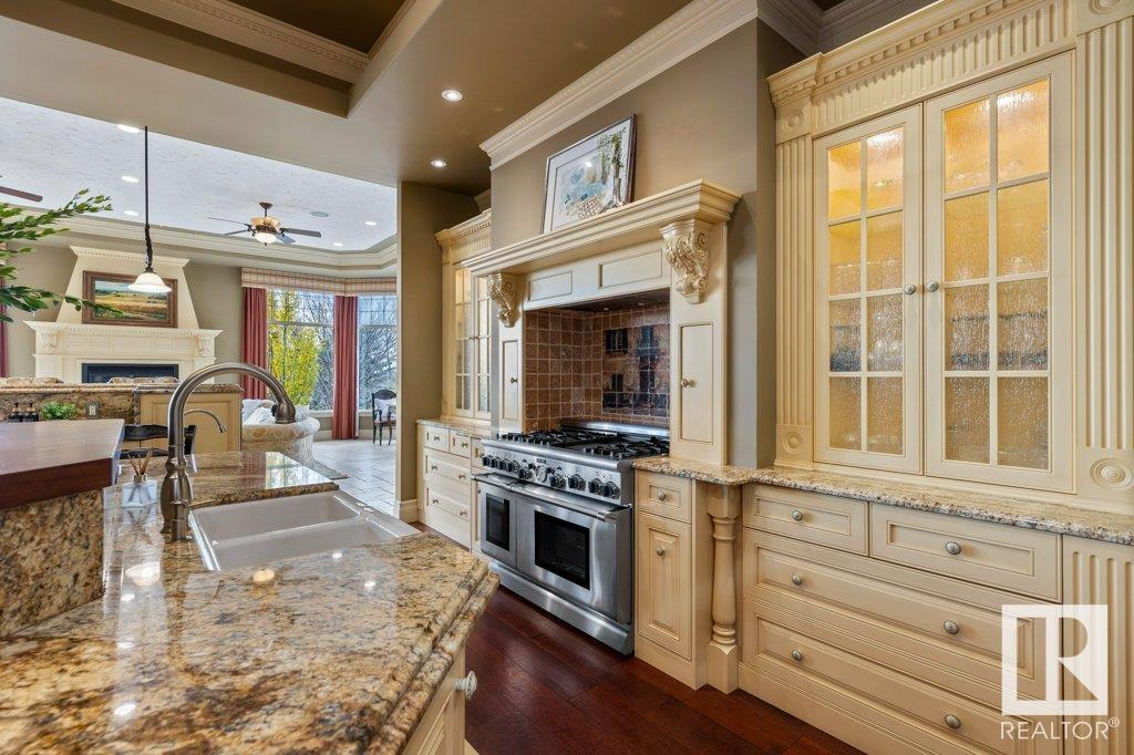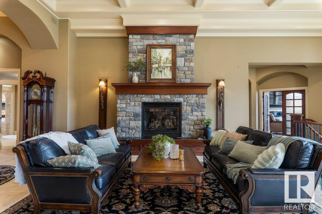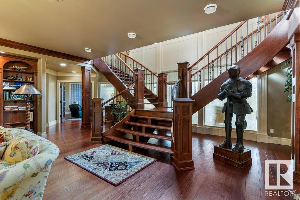 DISCOVER YOUR PRIVATE SANCTUARY IN RIVERSTONE POINTE FEATURING 8,800 SQFT OF SPECTACULAR LIVING SPACE this walk-out bungalow offers a rare blend of luxury and tranquility. With stunning river valley views, this custom-built masterpiece boasts captivating curb appeal, custom stone pillars, & a quad garage. Step inside to experience a true sanctuary, barrel roll ceiling, complete with limestone, cork & mahogany floors, coffered ceilings, custom millwork, grand designer staircase & banks of windows. The gourmet kitchen inspired by Clive Christian, featuring Brazilian hardwood, granite countertops, two expansive breakfast bar islands, and a massive pantry. Retreat to the resort-style primary suite, which includes a spa-inspired 6-piece ensuite with double stone showers, a gas fireplace and a lavish walk-in closet. With 5 bedrooms, 7 bathrooms, & 6 fireplaces, library, theatre room, exercise room, radiant heat, 52 ft. balcony & sports court, this home is perfect for both relaxation & entertaining! (id:7303)