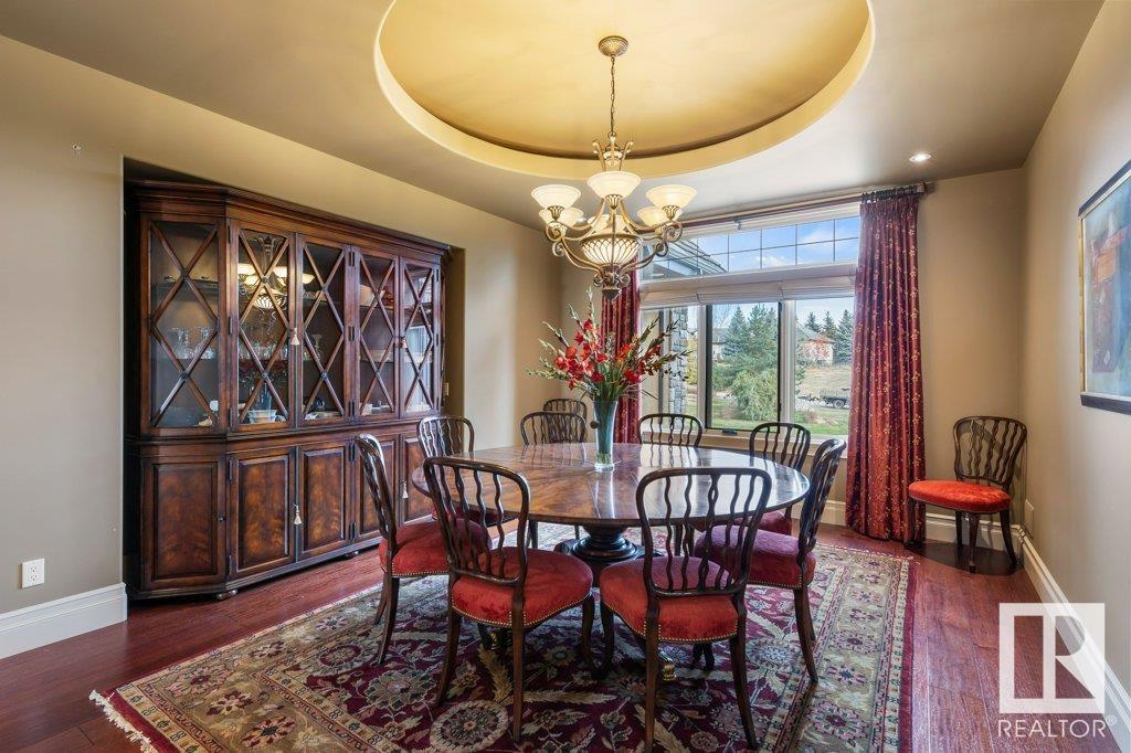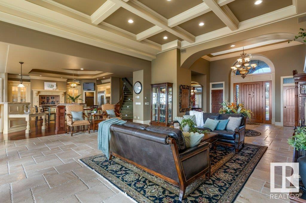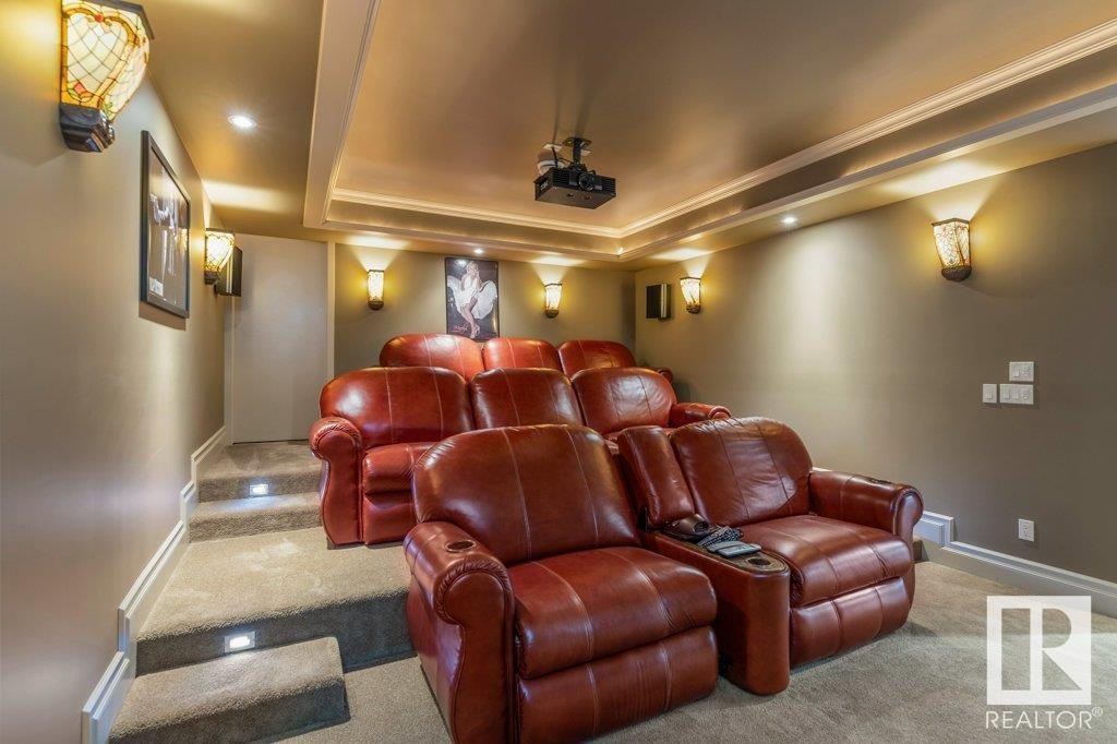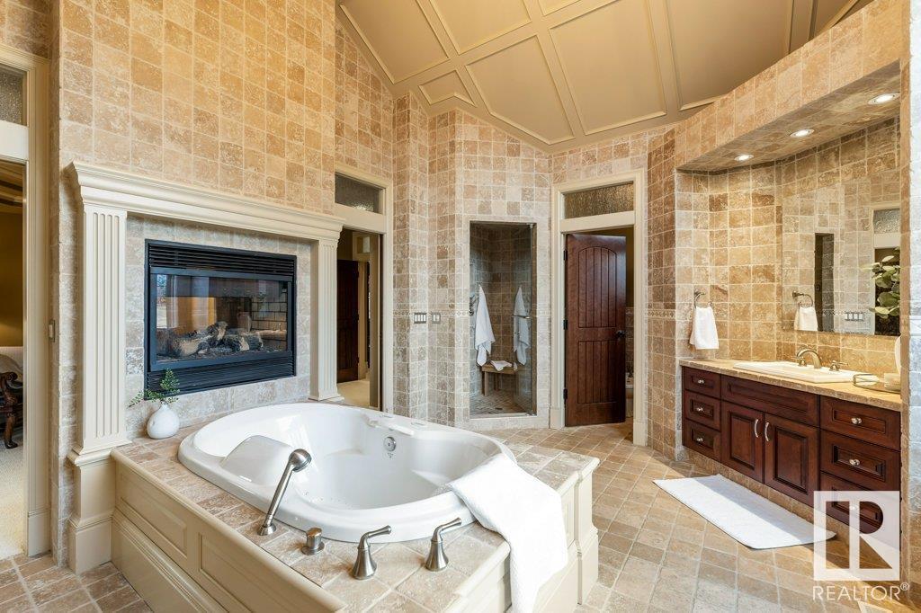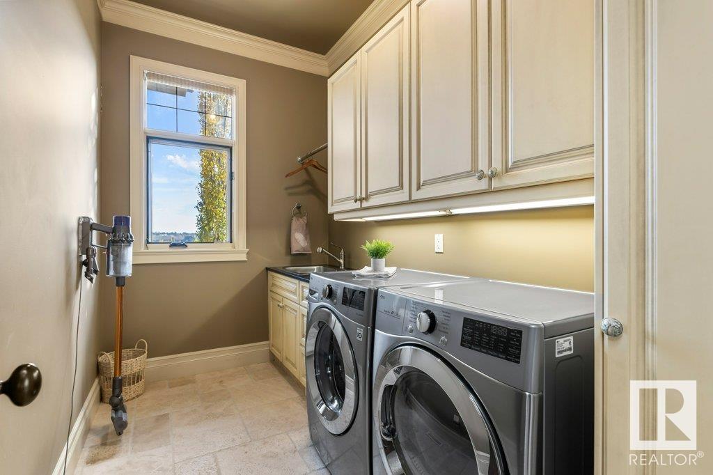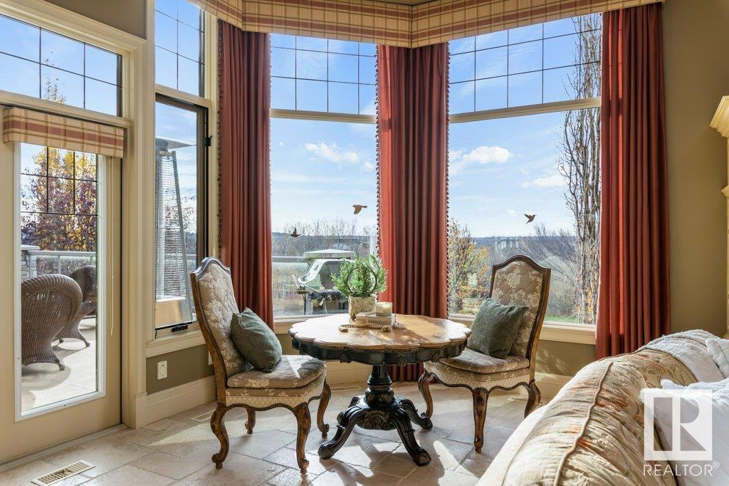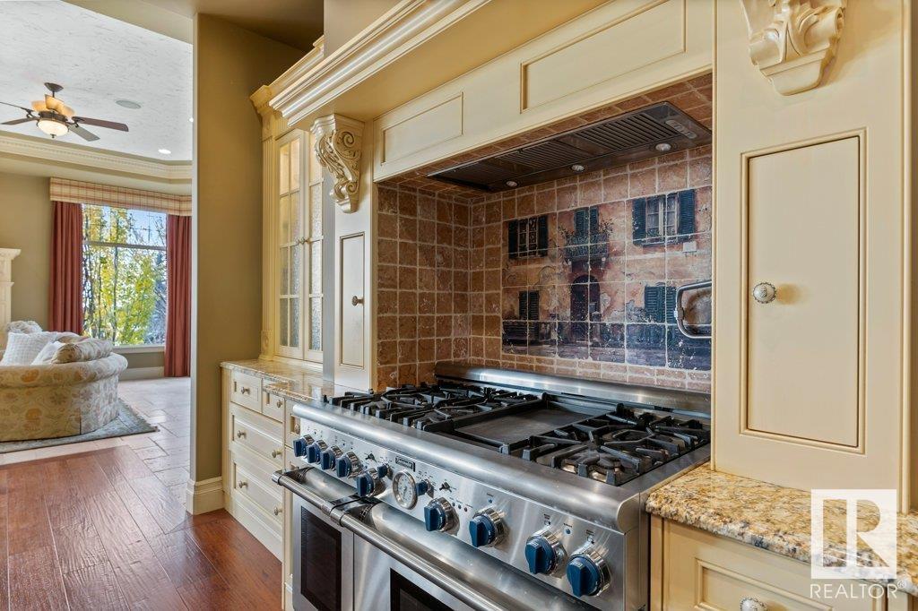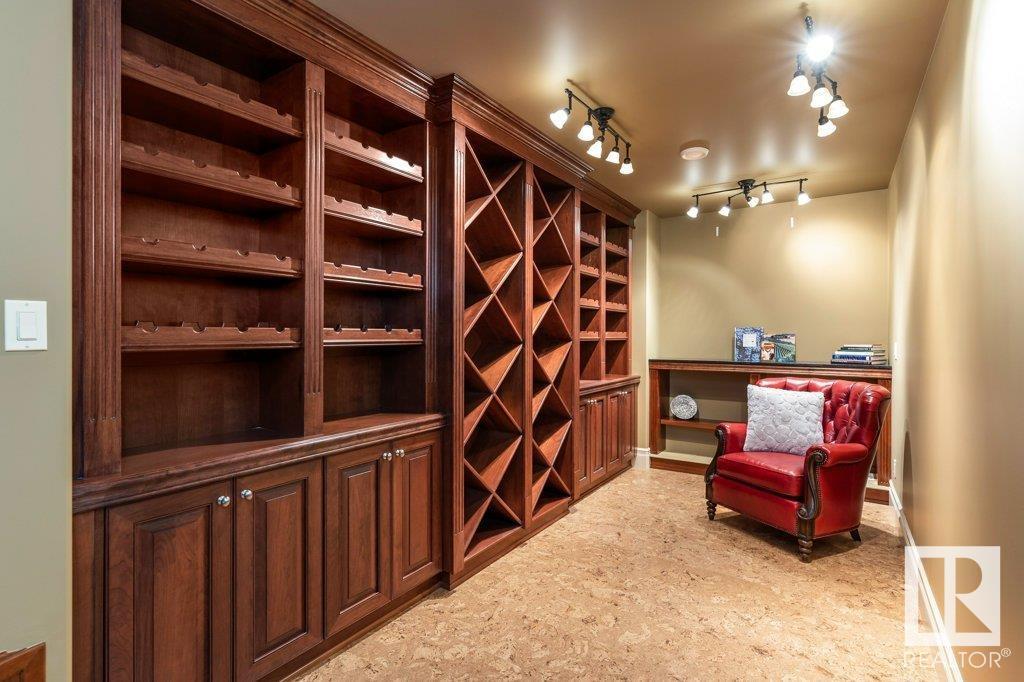 DISCOVER YOUR PRIVATE SANCTUARY IN RIVERSTONE POINTE FEATURING 8,800 SQFT OF SPECTACULAR LIVING SPACE this walk-out bungalow offers a rare blend of luxury and tranquility. With stunning river valley views, this custom-built masterpiece boasts captivating curb appeal, custom stone pillars, & a quad garage. Step inside to experience a true sanctuary, barrel roll ceiling, complete with limestone, cork & mahogany floors, coffered ceilings, custom millwork, grand designer staircase & banks of windows. The gourmet kitchen inspired by Clive Christian, featuring Brazilian hardwood, granite countertops, two expansive breakfast bar islands, and a massive pantry. Retreat to the resort-style primary suite, which includes a spa-inspired 6-piece ensuite with double stone showers, a gas fireplace and a lavish walk-in closet. With 5 bedrooms, 7 bathrooms, & 6 fireplaces, library, theatre room, exercise room, radiant heat, 52 ft. balcony & sports court, this home is perfect for both relaxation & entertaining! (id:7303)