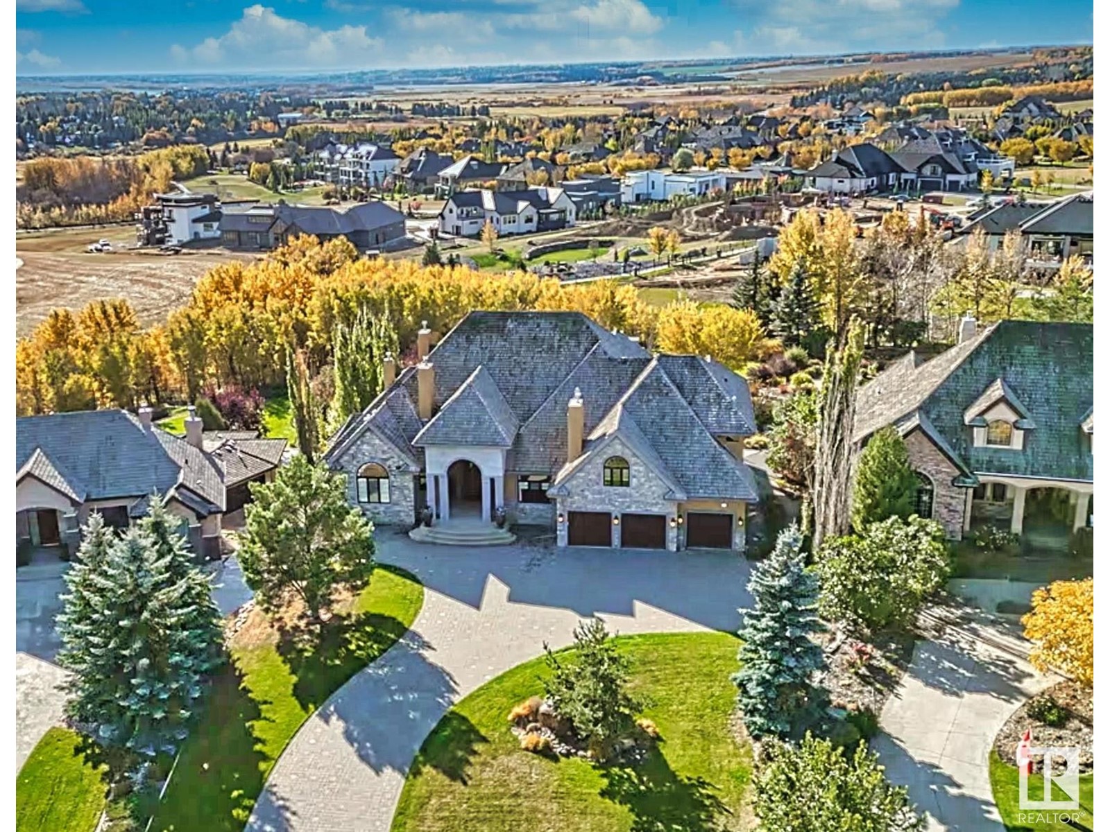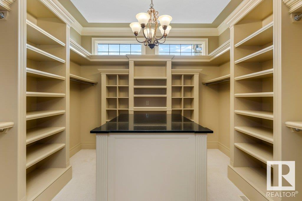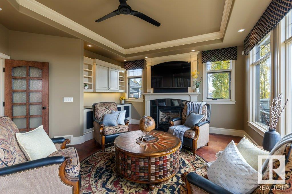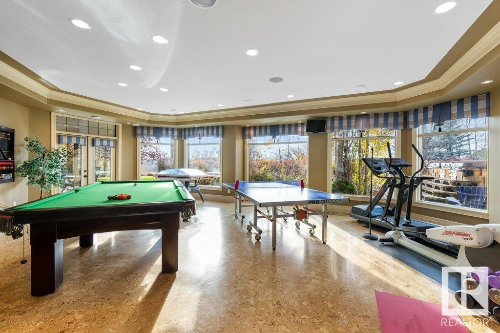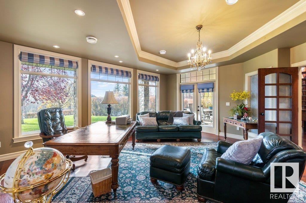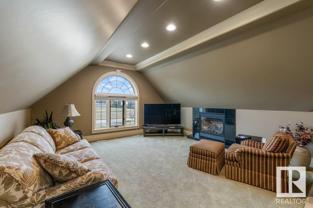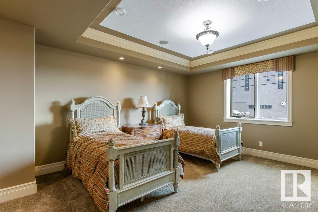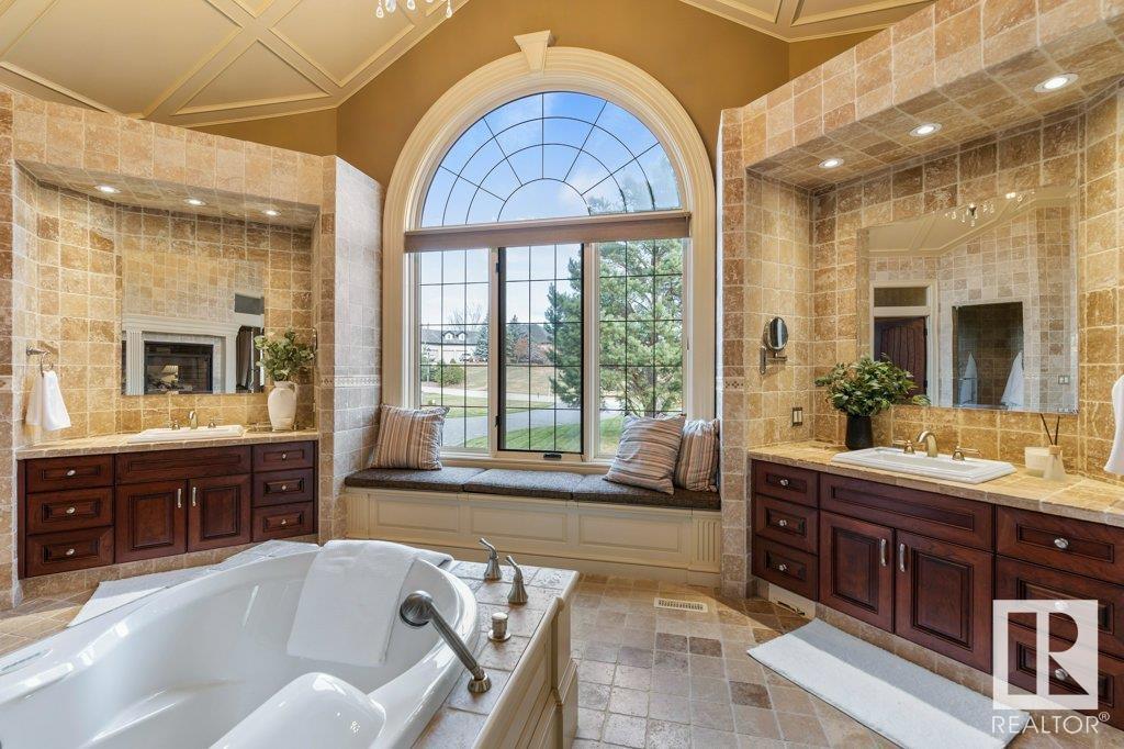 DISCOVER YOUR PRIVATE SANCTUARY IN RIVERSTONE POINTE FEATURING 8,800 SQFT OF SPECTACULAR LIVING SPACE this walk-out bungalow offers a rare blend of luxury and tranquility. With stunning river valley views, this custom-built masterpiece boasts captivating curb appeal, custom stone pillars, & a quad garage. Step inside to experience a true sanctuary, barrel roll ceiling, complete with limestone, cork & mahogany floors, coffered ceilings, custom millwork, grand designer staircase & banks of windows. The gourmet kitchen inspired by Clive Christian, featuring Brazilian hardwood, granite countertops, two expansive breakfast bar islands, and a massive pantry. Retreat to the resort-style primary suite, which includes a spa-inspired 6-piece ensuite with double stone showers, a gas fireplace and a lavish walk-in closet. With 5 bedrooms, 7 bathrooms, & 6 fireplaces, library, theatre room, exercise room, radiant heat, 52 ft. balcony & sports court, this home is perfect for both relaxation & entertaining! (id:7303)