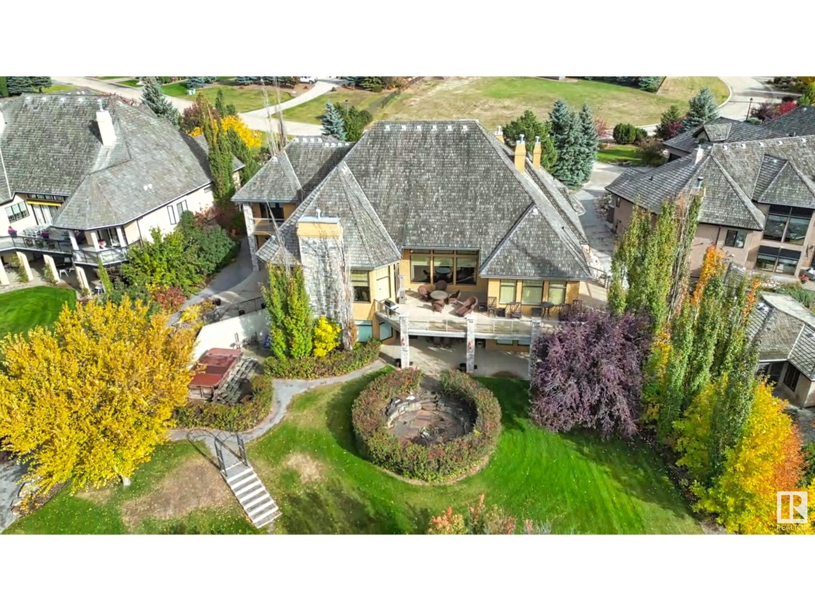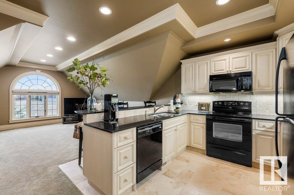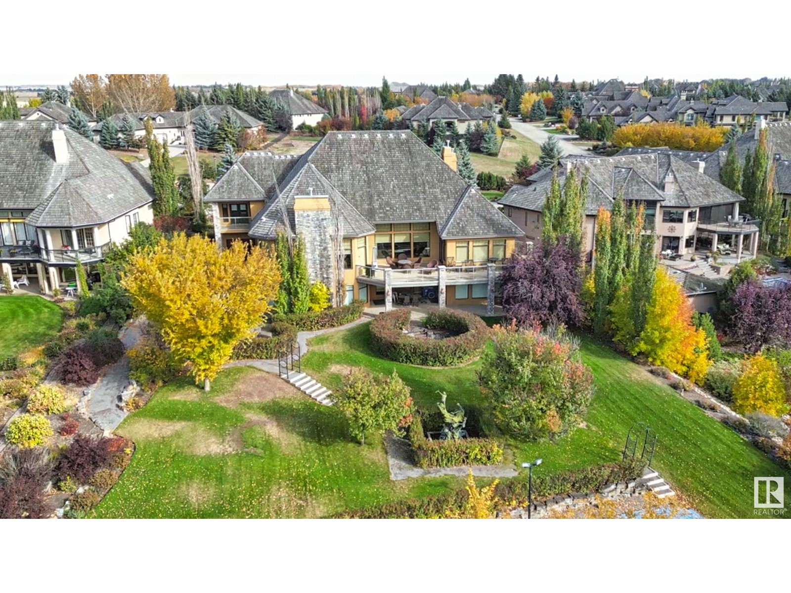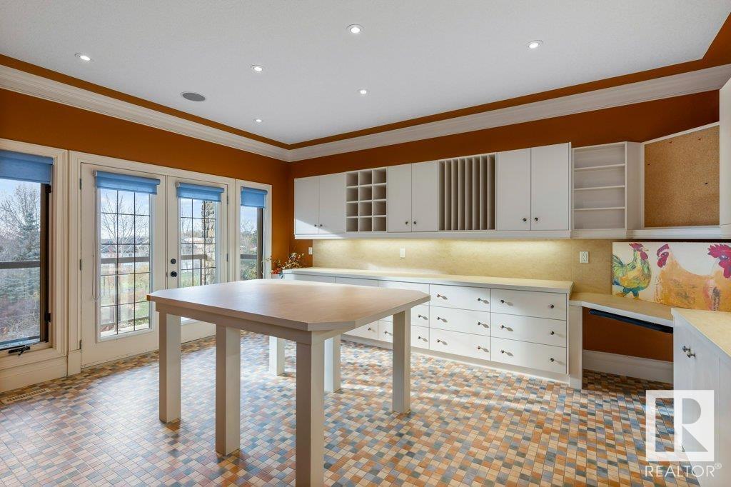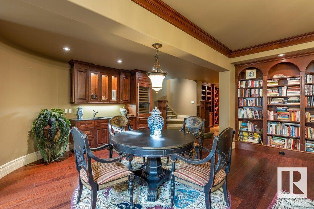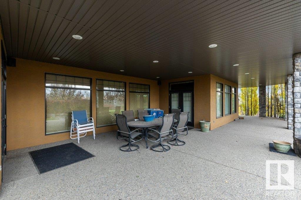 DISCOVER YOUR PRIVATE SANCTUARY IN RIVERSTONE POINTE FEATURING 8,800 SQFT OF SPECTACULAR LIVING SPACE this walk-out bungalow offers a rare blend of luxury and tranquility. With stunning river valley views, this custom-built masterpiece boasts captivating curb appeal, custom stone pillars, & a quad garage. Step inside to experience a true sanctuary, barrel roll ceiling, complete with limestone, cork & mahogany floors, coffered ceilings, custom millwork, grand designer staircase & banks of windows. The gourmet kitchen inspired by Clive Christian, featuring Brazilian hardwood, granite countertops, two expansive breakfast bar islands, and a massive pantry. Retreat to the resort-style primary suite, which includes a spa-inspired 6-piece ensuite with double stone showers, a gas fireplace and a lavish walk-in closet. With 5 bedrooms, 7 bathrooms, & 6 fireplaces, library, theatre room, exercise room, radiant heat, 52 ft. balcony & sports court, this home is perfect for both relaxation & entertaining! (id:7303)