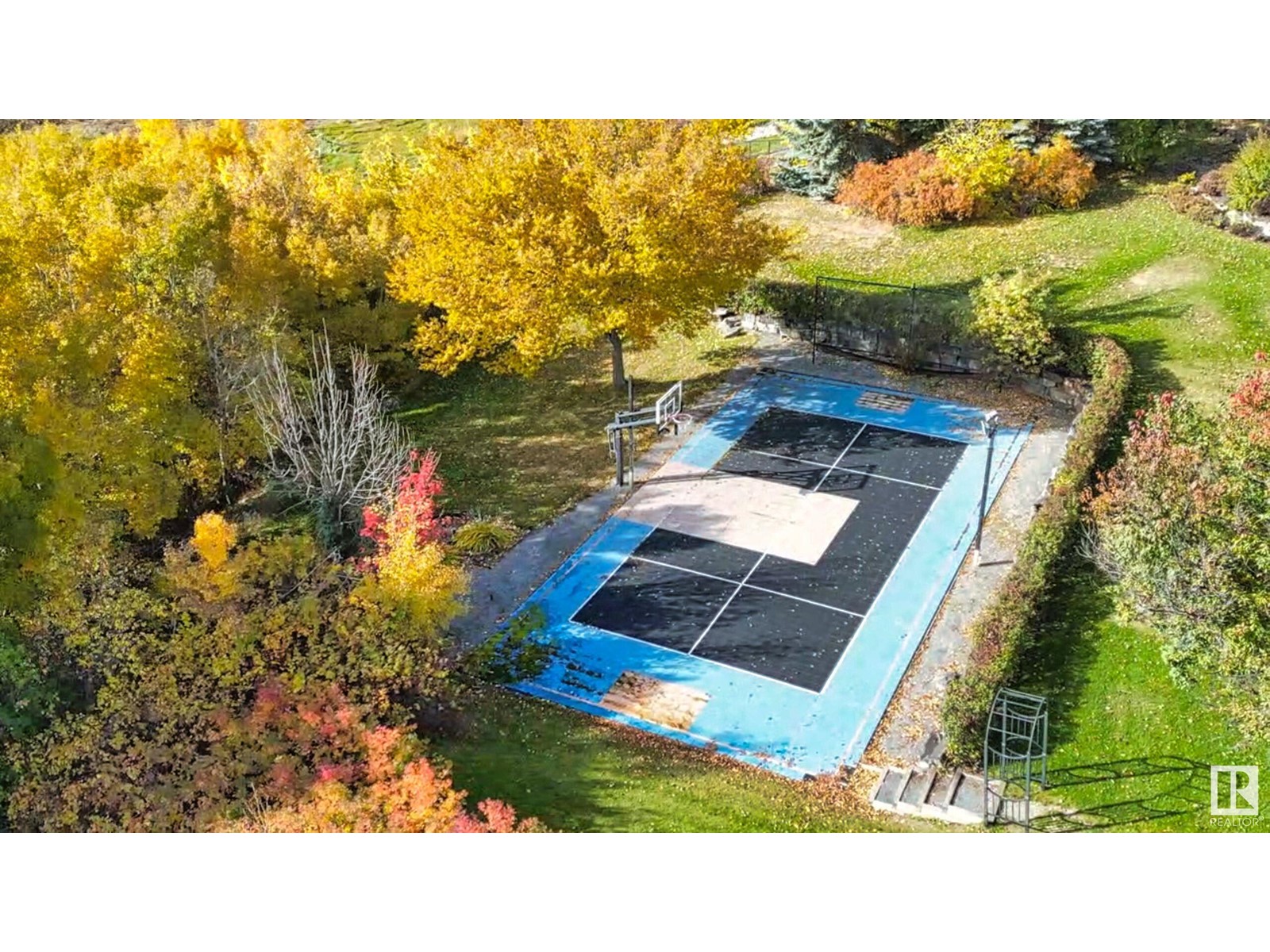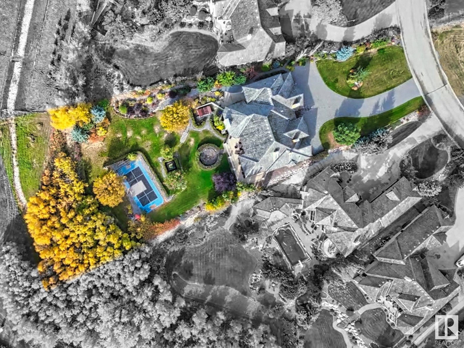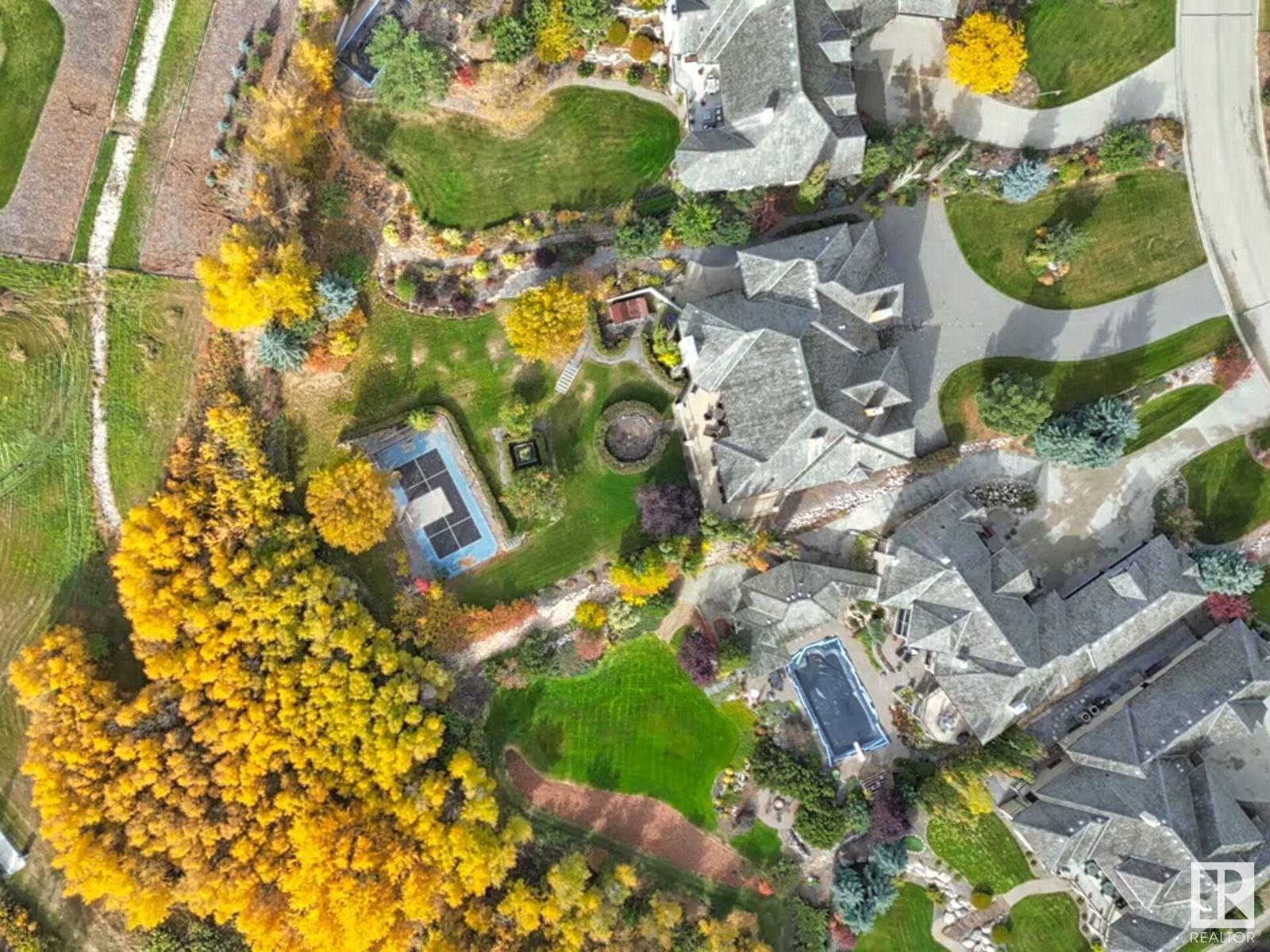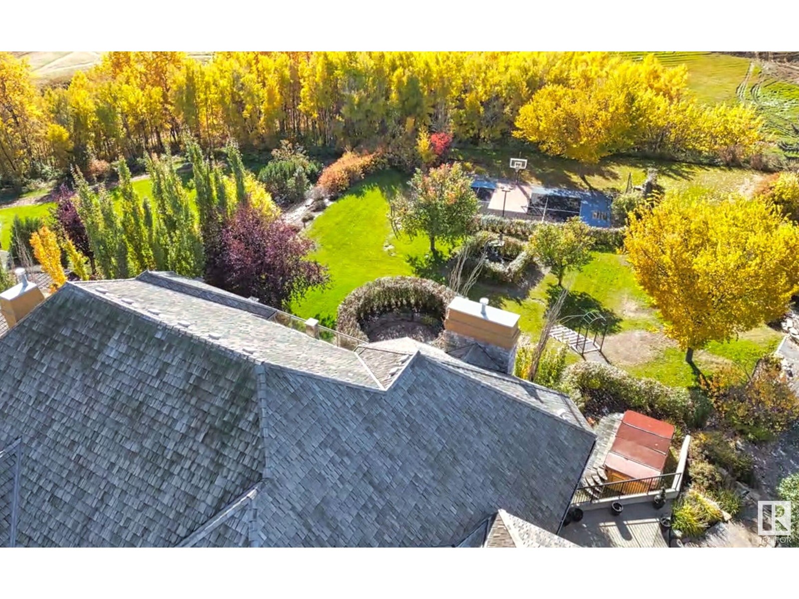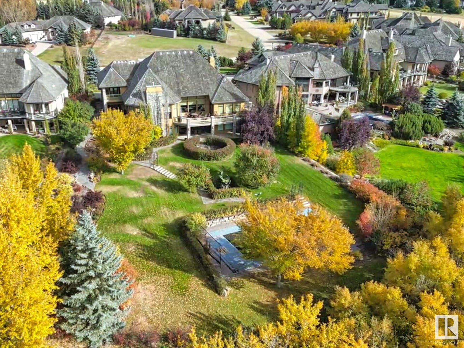 DISCOVER YOUR PRIVATE SANCTUARY IN RIVERSTONE POINTE FEATURING 8,800 SQFT OF SPECTACULAR LIVING SPACE this walk-out bungalow offers a rare blend of luxury and tranquility. With stunning river valley views, this custom-built masterpiece boasts captivating curb appeal, custom stone pillars, & a quad garage. Step inside to experience a true sanctuary, barrel roll ceiling, complete with limestone, cork & mahogany floors, coffered ceilings, custom millwork, grand designer staircase & banks of windows. The gourmet kitchen inspired by Clive Christian, featuring Brazilian hardwood, granite countertops, two expansive breakfast bar islands, and a massive pantry. Retreat to the resort-style primary suite, which includes a spa-inspired 6-piece ensuite with double stone showers, a gas fireplace and a lavish walk-in closet. With 5 bedrooms, 7 bathrooms, & 6 fireplaces, library, theatre room, exercise room, radiant heat, 52 ft. balcony & sports court, this home is perfect for both relaxation & entertaining! (id:7303)